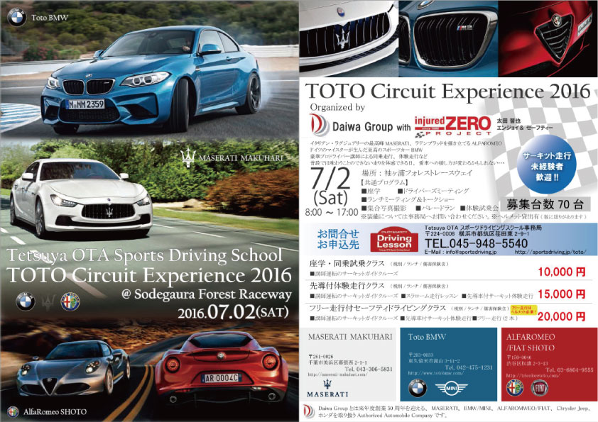 ダイワグループでは、このたび、マセラティ幕張、Toto BMW、MINI西東京、MINI杉並、アルファロメオフィアット松濤各店舗をご利用頂いているお客様を対象に、日頃のご愛顧と、愛車をより深く知る体験をして頂くことを目的とし、Tetsuya OTAスポーツドライビングスクールが行う「injured ZEROプロジェクト/ENJOY&SAFET DRIVING LESSON」とコラボレーションし、ドライビングレッスンを開催いたします。